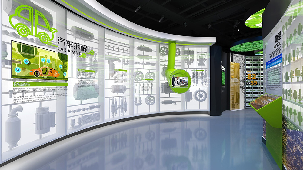 展館內(nèi)容和展示分區(qū)規(guī)劃上,除了做一些基礎的圖文科普知識外,還可以設置一些實物展示區(qū),將一些可以重復利用的垃圾變廢為寶,展館內(nèi)的面積有限,所以不是所有展館都可以做到參觀和垃圾分揀流水線展現(xiàn)在同一個空間,這就需要設置一些多媒體展示區(qū),通過高科技展示手段實現(xiàn)這方面需求。